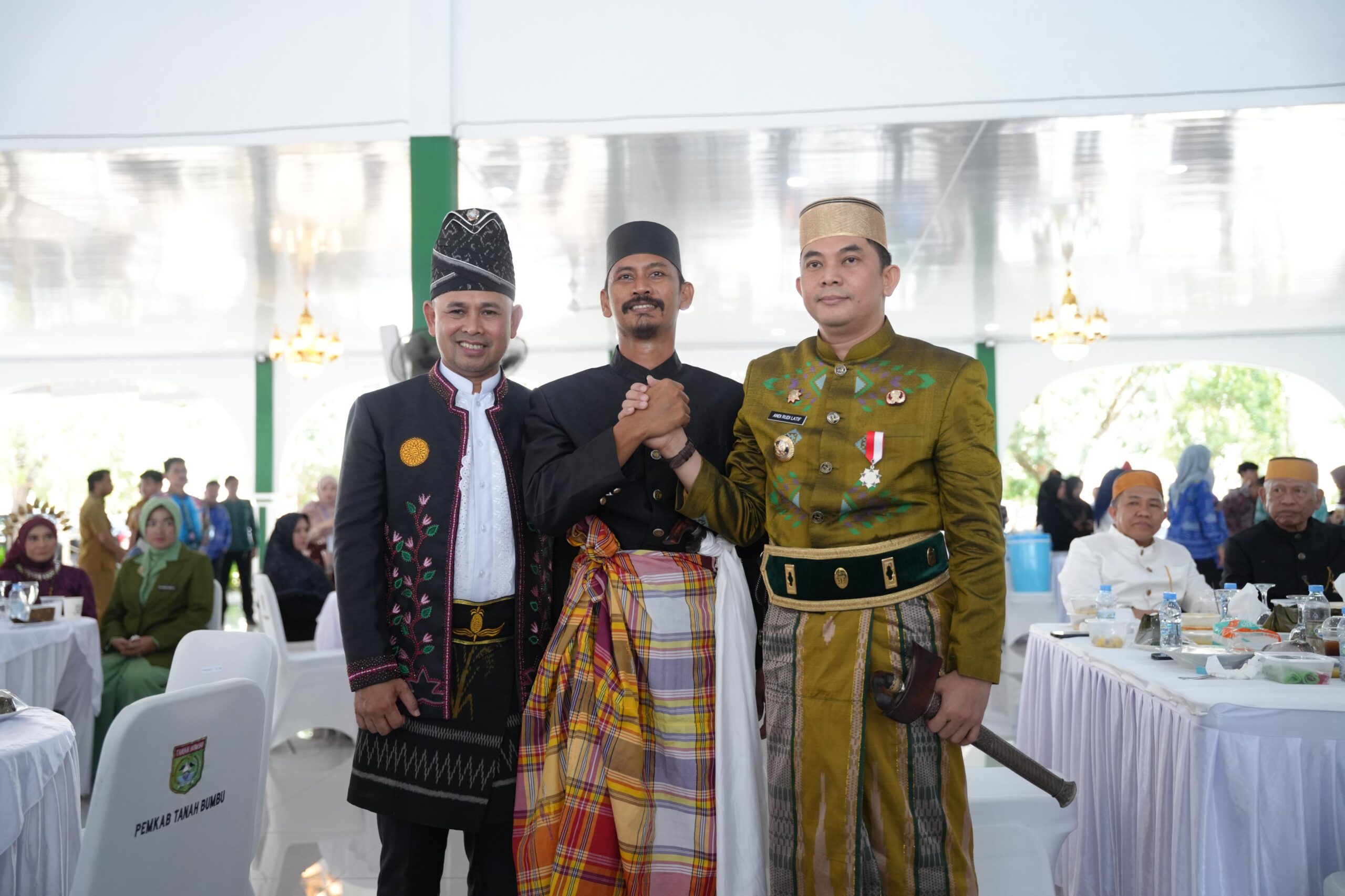 Bupati Tanah Bumbu, Andi Rudi Latif, didampingi H. Bahsanuddin usai menerima senjata pusaka dari Komunitas Budaya Mantra Bumi.