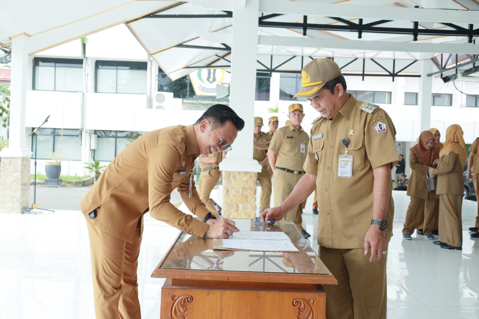 Wawancara membahas tindak lanjut dari Perjanjian Kinerja (PK) yang telah ditandatangani sehari sebelumnya, Senin (3/2), oleh Sekretaris Daerah, Staf Ahli Bupati, Sekretaris DPRD, 19 Kepala Dinas, 8 pimpinan instansi, dan 17 camat di hadapan Pj. Bupati Dinansyah di halaman Kantor Bupati.
