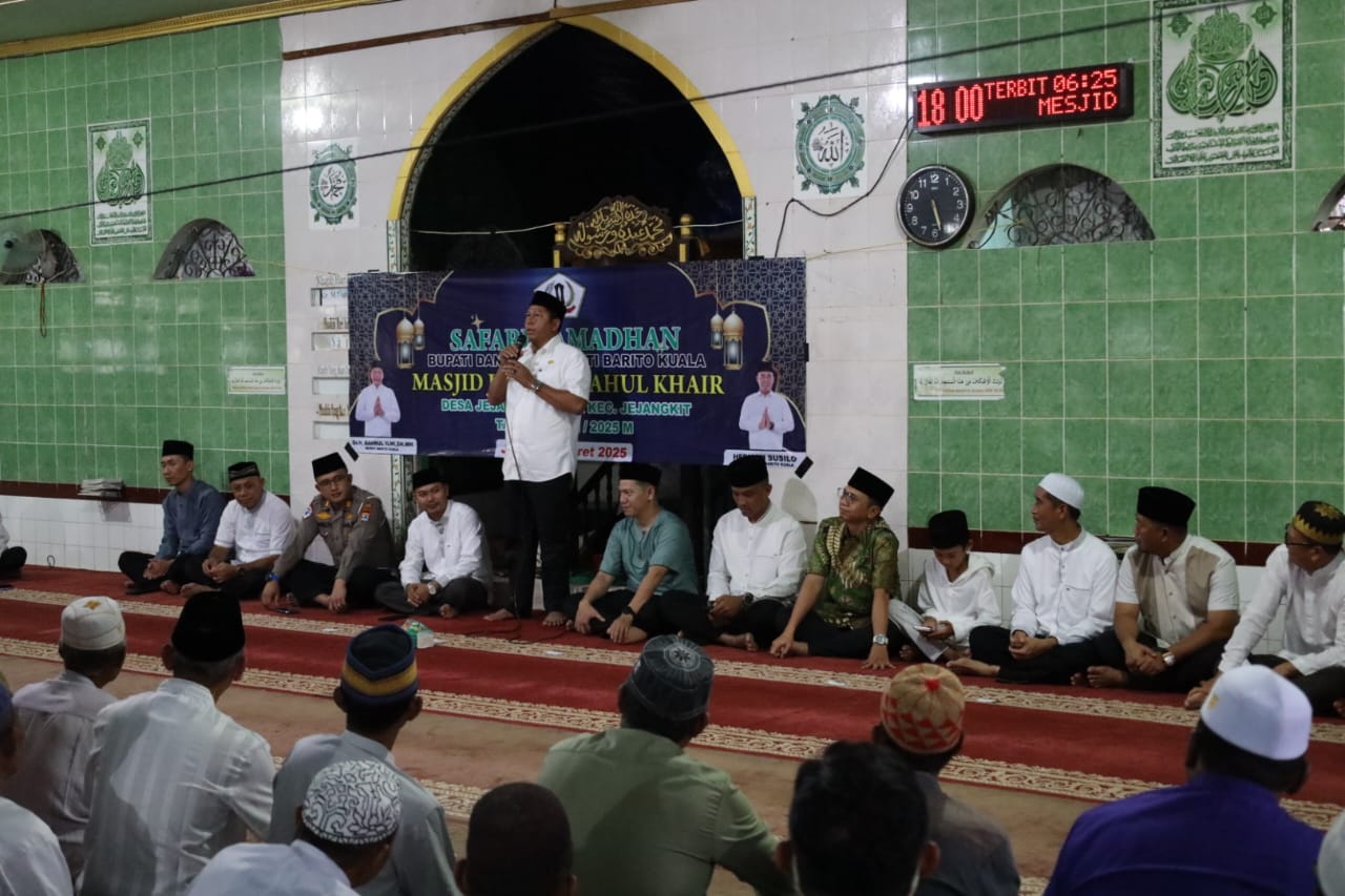 Arah-berita, Barito Kuala – Bupati Barito Kuala, Dr. H. Bahrul Ilmi, S.H., M.H., menghadiri Safari Ramadhan Pemerintah Kabupaten Barito Kuala di Masjid Jami Miftahul Khair, Desa Jejangkit Pasar, Kecamatan Jejangkit, Jumat (14/3/2025). Kegiatan ini menjadi momentum untuk mempererat silaturahmi sekaligus menyalurkan bantuan bagi pembangunan masjid.
