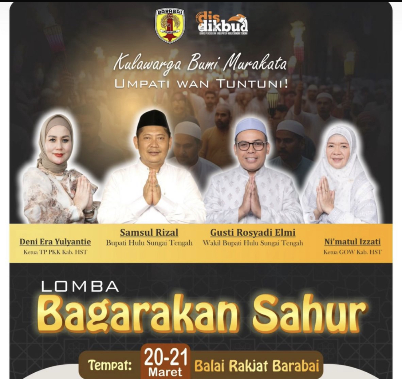 Arah-berita, Hulu Sungai Tengah – Pemerintah Kabupaten Hulu Sungai Tengah (HST) melalui Dinas Pendidikan dan Kebudayaan (Disdikbud) HST kembali menggelar Lomba Bagarakan Sahur untuk menyemarakkan bulan suci Ramadan yang akan berlangsung pada 20-21 Maret 2025 di Balai Rakyat Barabai.